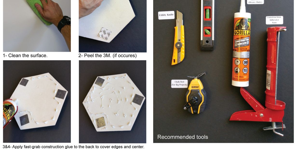 4- Align the edge of peeled part with the previous installed tile edge and stick it to the surface as shown in Figure 4. Peel off the rest of the backing gradually and stick the tile completely. (Please note that the backing adhesive is very strong and cannot be adjusted once installed.)